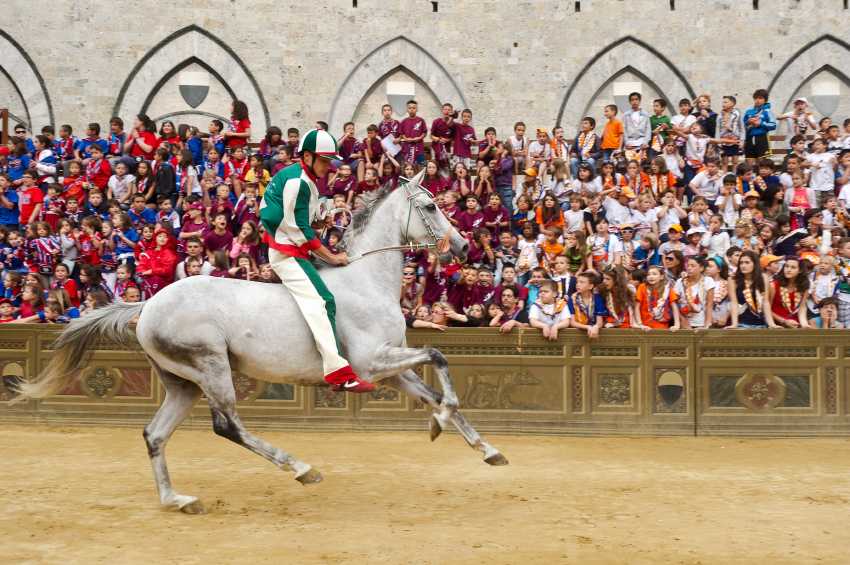 ללא ספק, פיאצה דל קאמפו היא אחת הכיכרות היפות ביותר בעולם. הכיכר, הנמצאת בנקודת המפגש בין שלוש הגבעות עליהן שוכנת העיר סיינה, בנויה בצורת מניפה, מרוצפת לבנים חומות אדומות ומוקפת ארמונות שנבנו בתקופות שונות אך עם זאת יוצרים הרמוניה ארכיטקטונית. בעבר היה כאן שדה פתוח וירוק (campo) בו התכנסו סוחרים ונערכו שווקים וירידים. צורתה העכשווית התגבשה באמצע המאה ה-14, עת רוצפה הכיכר בלבני טרקוטה אדומות המסודרות כשדרת דג. היא מחולקת לתשעה חלקים, זכר ל"ממשלת ה-9", תשעת נבחרי הציבור ששלטו בסיינה בין השנים 1287-1355 – תקופת העצמאות של סיינה כעיר מדינה עצמאית. פעמיים בשנה, ב-2 ביולי וב-16 באוגוסט, נערך בכיכר מרוץ הסוסים המפורסם הנקרא ה"פאליו", שבו מתחרים זה בזה רוכבי סוסים המייצגים את רבעי העיר השונים, שקרויים בשמותיהם של חיות. לכל רובע שם, תלבושת ייחודית, דגל משלו, מוזיאון, כנסייה, ותהלוכה אופיינית. הרוכבים אמורים להקיף את הכיכר שלוש פעמים במינימום זמן. הסוס המנצח, לא חשוב אם יש עליו רוכב או שמא נפל באחת ההקפות, מביא את הפרס – פאליו – (סמרטוט) לרובע הזוכה. ביום התחרות הופכים מרפסותיהם וחלונותיהם של הארמונות סביב הכיכר ל'יציעים', מהם משקיפים ברי המזל על התחרות. בחזית הכיכר נמצא פאלאצו פובליקו (ארמון העם) ו'טורה דל מאנג'ה (מגדל הפעמונים), ממנו נשקפים נופיה הנפלאים של סיינה.